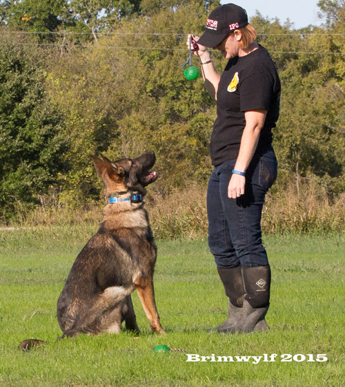 Now in IGP, we like the dog to work "in drive", to be in an excited state. This helps to get the points for power and speed that the judges look for. It also creates a nice picture of a dog joyfully working for his handler. The dog must learn to work and to respond to commands even when his primary focus is on a toy or even a helper.